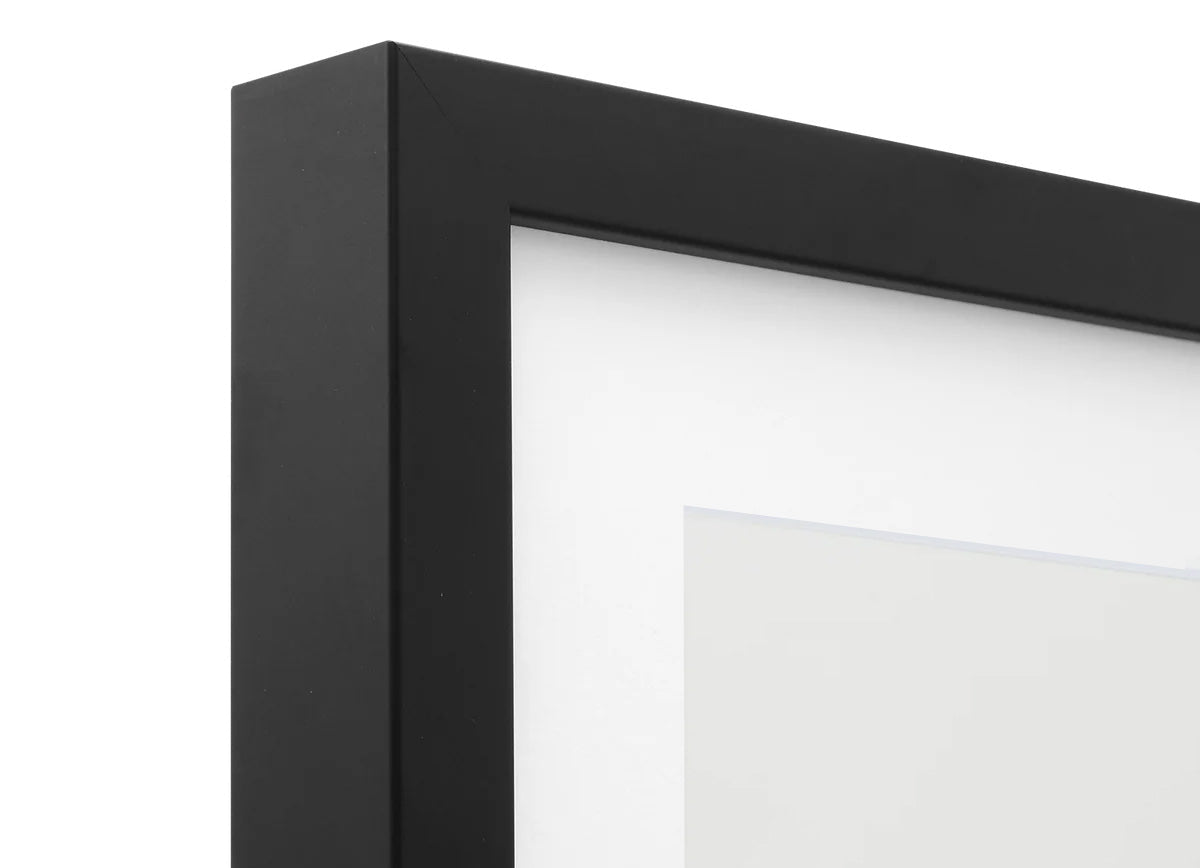 Ready-to-hang, hand crafted frames from sustainable (FSC/PEFC) hardwood. Black, white, and oak finishes with UV-resistant acrylic. Installed hanging wires from sizes 1-3 with D-Hooks from sizes 4-7. All frames are high quality, eco-friendly design.